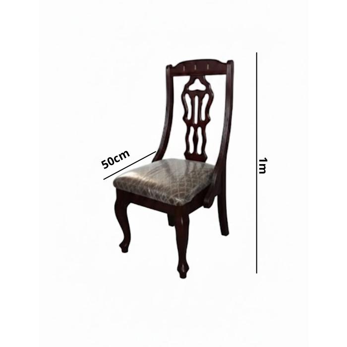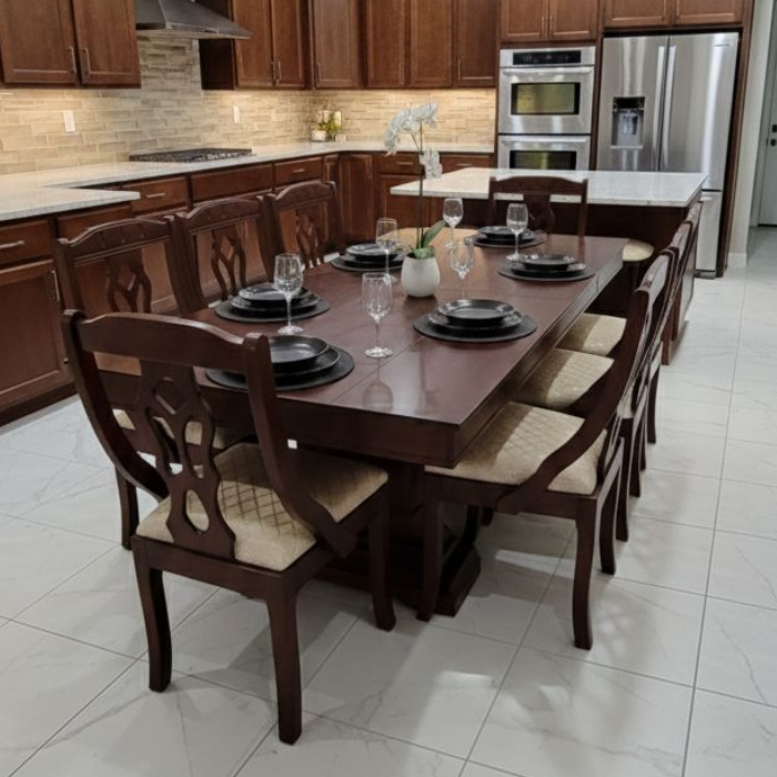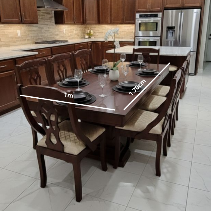 La mesa rectangular ofrece amplio espacio para 8 personas, perfecta para reuniones familiares y eventos especiales. Sus sillas cuentan con respaldo decorativo y asiento acolchonado en tono claro, brindando comodidad y un atractivo contraste visual.