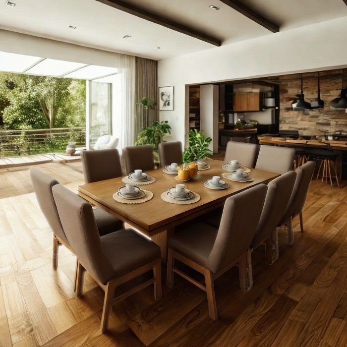 El Antecomedor TELL Jared 10 Sillas es una pieza de alto diseño ideal para quienes buscan elegancia, funcionalidad y espacio. Su mesa rectangular en acabado chapa de encino destaca por su robustez y estética contemporánea, brindando una superficie amplia y resistente para compartir comidas, reuniones o celebraciones.