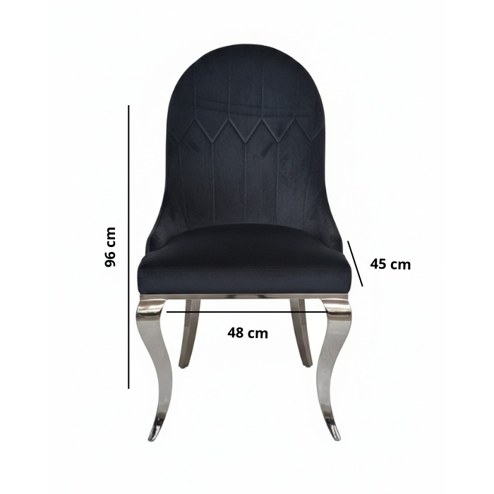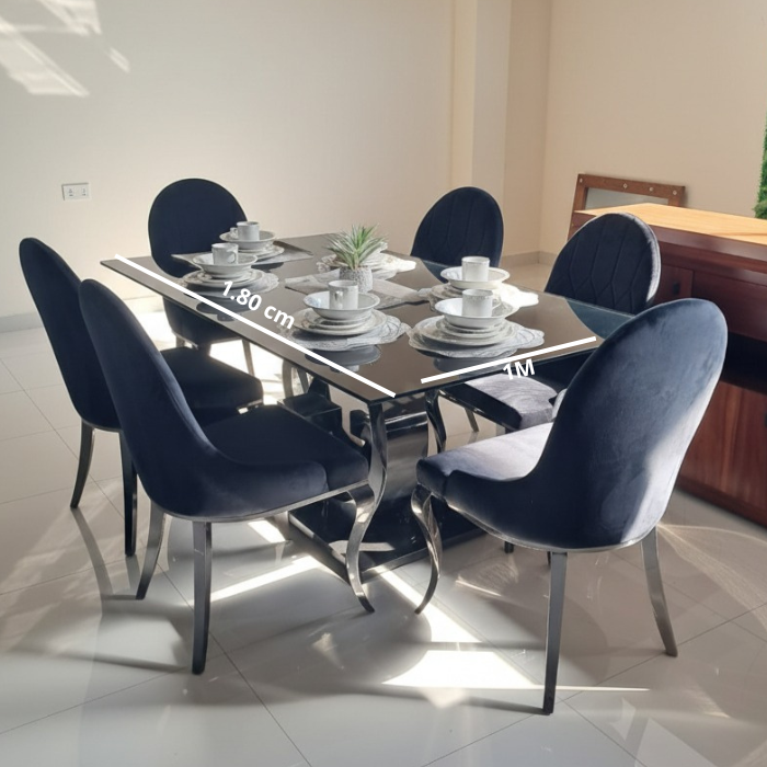 Incluye 6 sillas tapizadas en tono azul marino, con respaldo ergonómico y asiento acolchado que garantizan comodidad y distinción. Su combinación de materiales y colores lo hace perfecto para comedores modernos y elegantes.