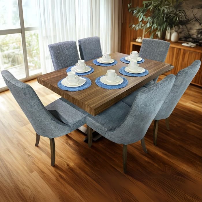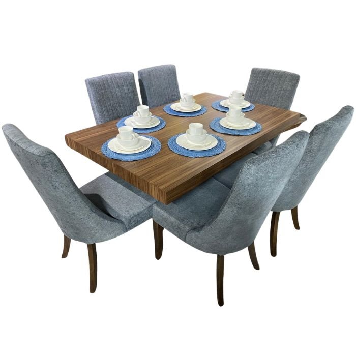 Incluye seis sillas ergonómicas tapizadas en tela gris suave, con respaldo curvo que se adapta perfectamente a la forma del cuerpo, brindando comodidad en cada comida. Las patas en madera natural refuerzan la armonía estética entre modernidad y calidez.