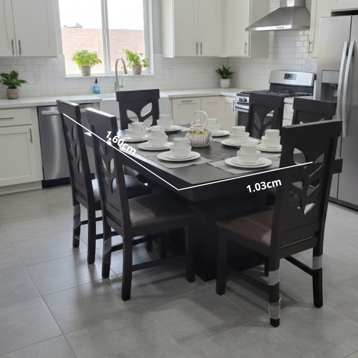 La mesa rectangular ofrece excelente estabilidad y espacio suficiente para reuniones familiares, acompañada de 6 sillas con asiento tapizado en vinil color roble con costura decorativa, que brinda comodidad, fácil limpieza y mayor durabilidad para el uso diario.