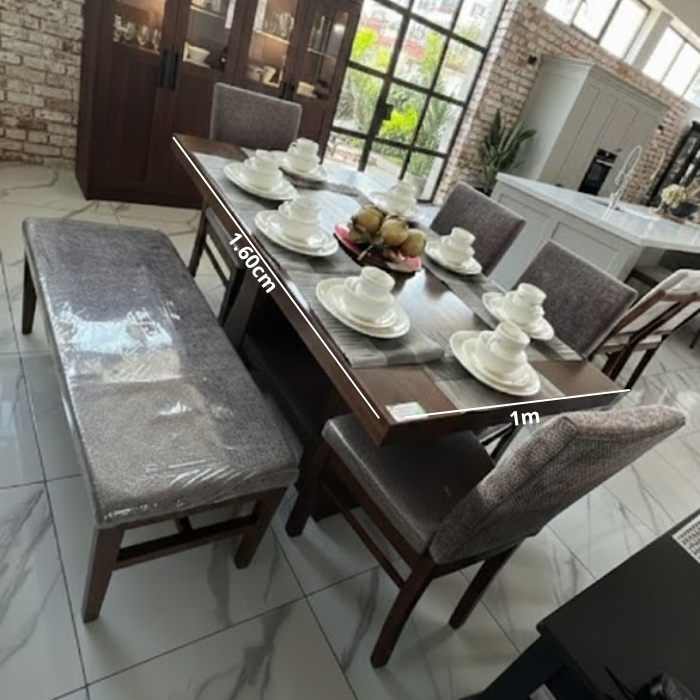 Comedor Constanza Emma con pedestal, diseño elegante en tono madera con tapizado en sillas y banca para mayor confort. Ideal para espacios modernos que buscan presencia y funcionalidad.