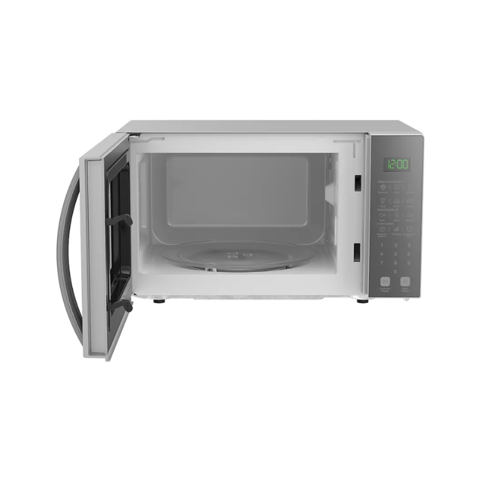 Cuenta con 10 niveles de potencia que permiten ajustar la intensidad de cocción según la receta; además presenta 6 programas preestablecidos, facilitando tareas comunes como recalentar o cocinar platillos básicos sin complicaciones. La función de descongelar agiliza la preparación de alimentos congelados, mientras que la luz interior y el plato giratorio garantizan una distribución uniforme del calor.