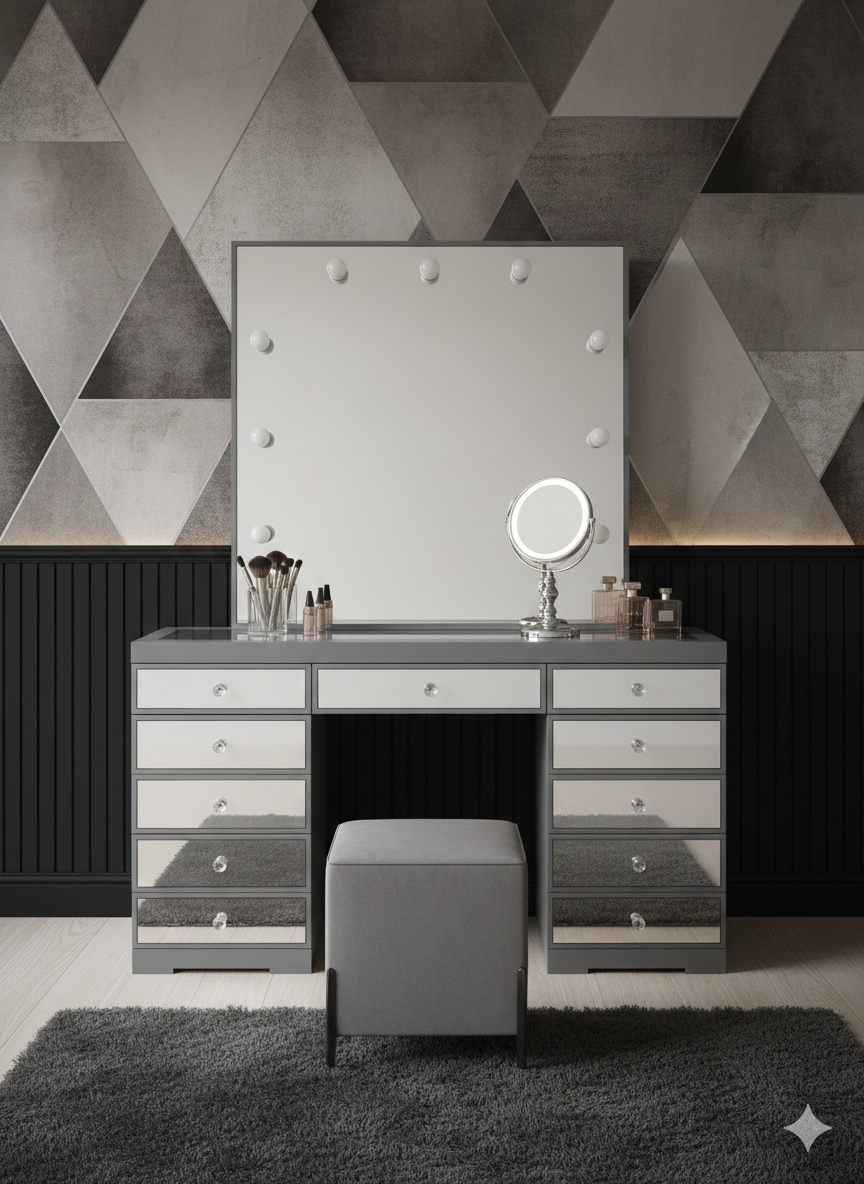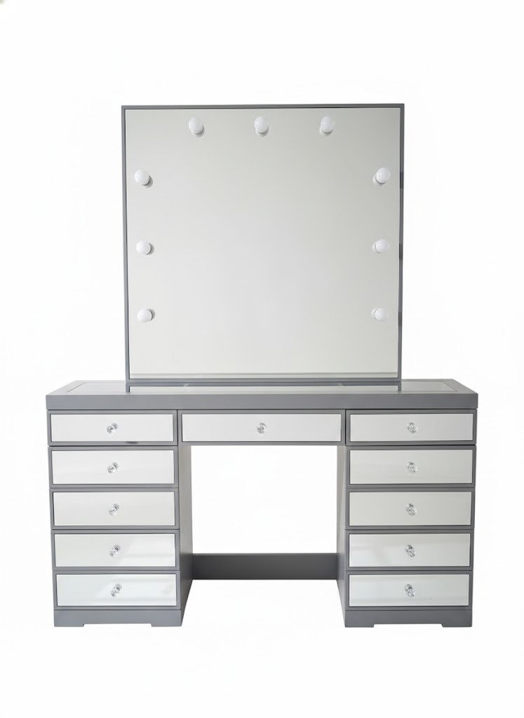 El Tocador Tell Hollywood con Espejos de Cristal destaca por su diseño elegante, moderno y sofisticado, ideal para quienes buscan un espacio funcional con un toque de glamour. Incorpora un espejo amplio con iluminación tipo Hollywood, que brinda una visibilidad clara y uniforme para maquillaje o cuidado personal. Sus frentes de cajón con acabado espejo de cristal aportan profundidad visual y un estilo contemporáneo que realza cualquier recámara o vestidor.